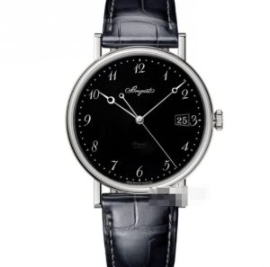 文字盤にはブレゲ伝統的なグラン・フー・エナメルが用いられ、ピュアブラックの文字盤は、アラビア数字インデックスとロジウムメッキブレゲ針のエレガントな質感をさらに際立たせています。